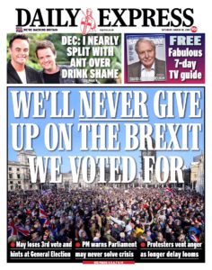 “Nigel Farage spoke after yesterday’s Brexit march in an attempt to inspire Leave supporters despite Brexit not taking place on March 29. Mr Farage insisted he was more determined to “fight back against this political class” after what he described as a Brexit “betrayal.” The LBC host began by saying: “I believe that what has happened over there has not just turned this day, that should have been one of great celebration, into a day that history will mark as a day of betrayal.”…The crowd then exploded into cheers of support as chants of “Nigel” can be heard from the Brexiteers.” – Daily Express