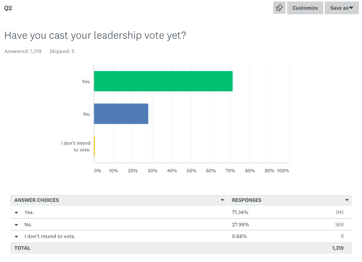 Most Party members therefore appear to have voted between last week’s survey and this week’s. If the survey is accurate, it would be reasonable to assume, on the evidence available at the moment, that Johnson will win somewhere between 67 per cent and 72 per cent of the vote. We will be publishing further surveys as the contest continues.