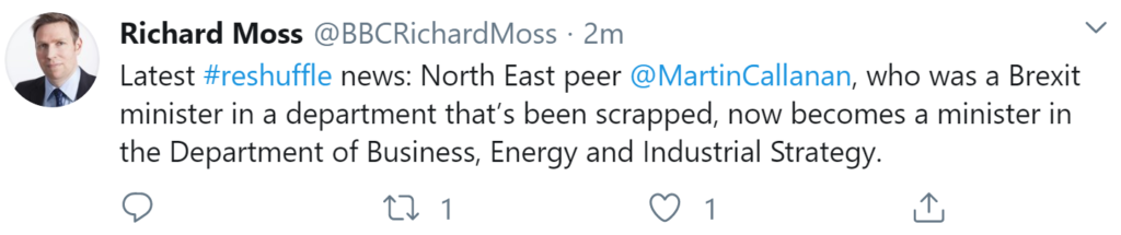 - Brexiteering Simon Clarke promoted to be Minister of State at HCLG.