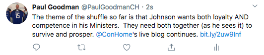 - James Cleverly is off to the Foreign Office as a Minister of State with a characteristically stylish tweet. It doesn’t looks as though he will continue to attend Cabinet. He will also be a DfID Minister – but that’s a continuation of present practice, not part of a radical restructuring.