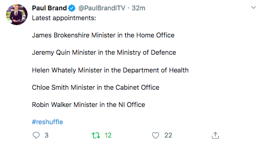 It looks as if the reshuffle has petered out, so we’re going to wrap up this live blog. To conclude, here is the full list of the membership of the new Johnson Cabinet (image by Political Intelligence):