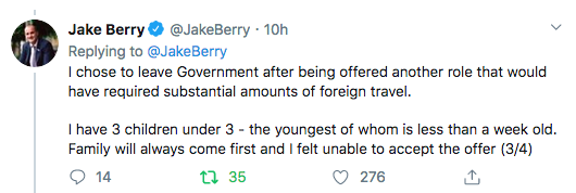 - Jake Berry has turned down a move to the Foreign Office, which would apparently have involved the loss of his present right to attend Cabinet – see above, where he refers to the family commitments that arise from having three young children under three. He is one of the former backbench band of Johnson True Believers.