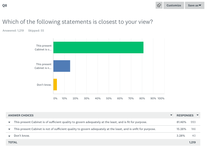 - 81 per cent of respondents, some four in five, think the Cabinet is adequate at least, and basically fit for purpose – not a high bar, you may think.