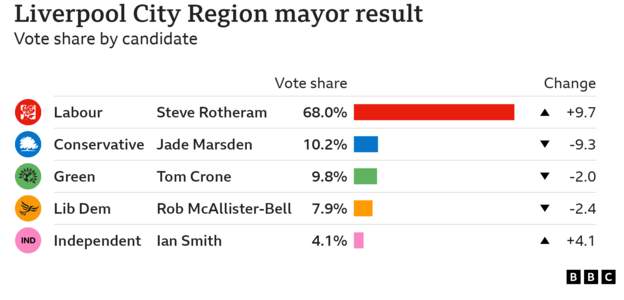 - Labour’s Steve Rotheram has won re-election as Mayor of the Liverpool City Region. The Conservatives held on to second place.