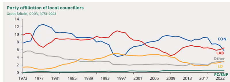 This chart from the House of Commons Library illustrates what has happened. The Conservatives have had a pretty good run in local elections for a pretty long time.