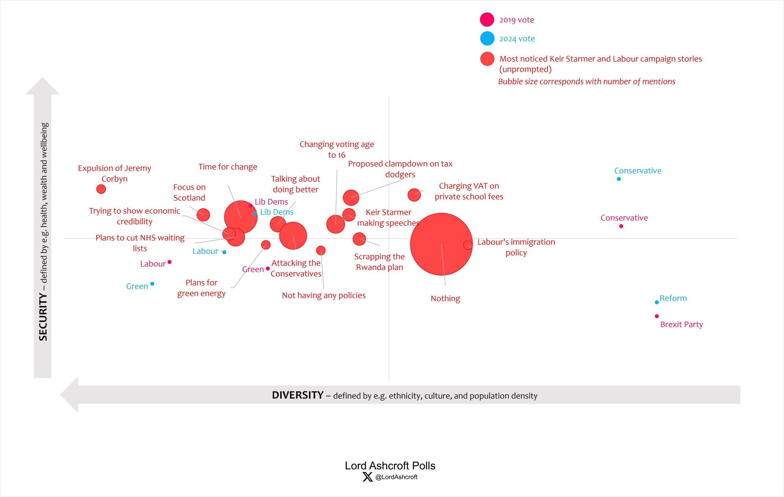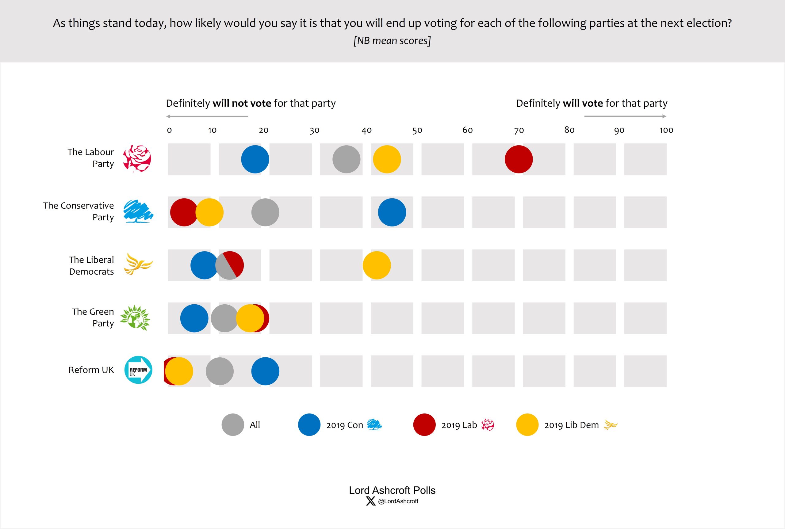 Taking into account those whose highest score for one party was at least 50/100, this implies vote shares of Labour 47 per cent, Conservative 24 per cent, Reform UK 11 per cent, Green 8 per cent, Lib Dem 6 per cent.