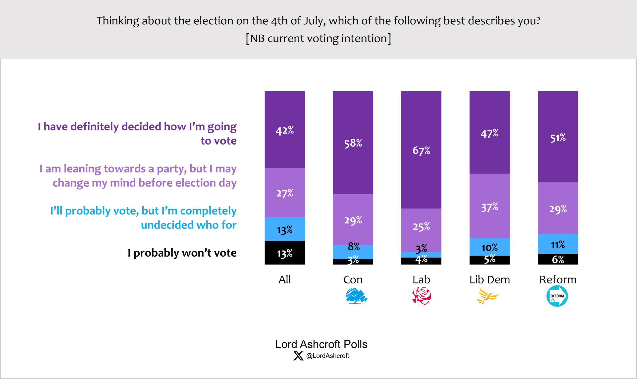 Only 42 per cent of all respondents, including two-thirds of those intending to vote Labour and half of those leaning towards Reform UK said they had definitely decided how to vote on 4 July.