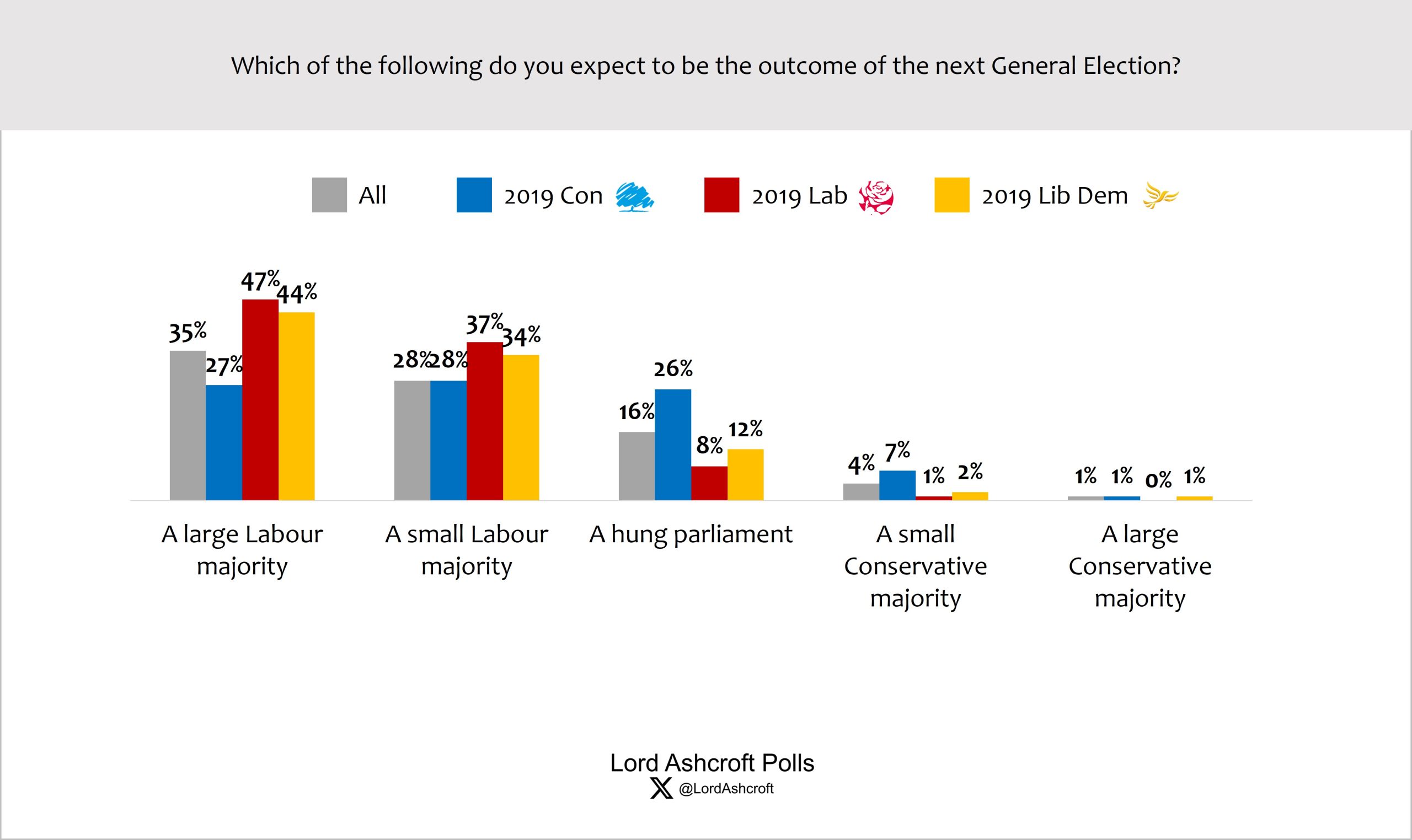 Nevertheless, most voters said they expected a clear Labour majority, including most 2019 Tories and nearly half of those who intend to vote Conservative on 4 July.