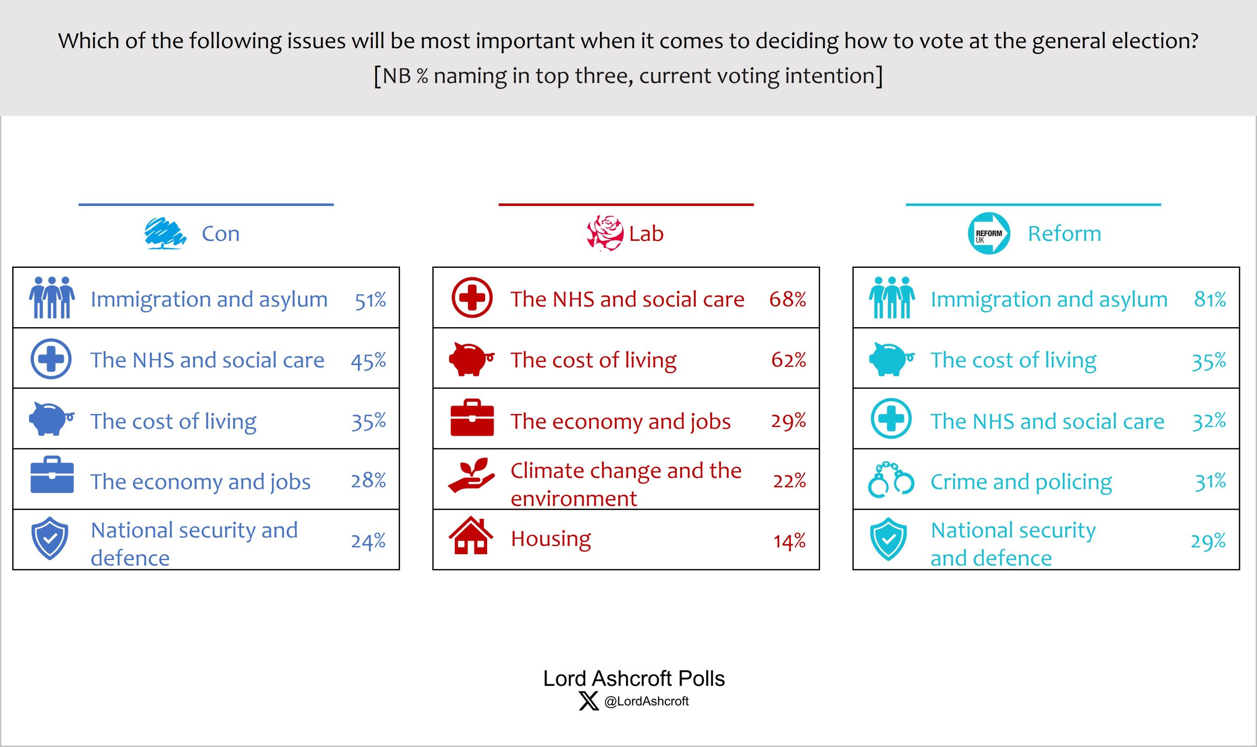 When we asked people which issues would be most important when they decided how to vote, the top answers were the NHS, the cost of living, immigration, the economy, and climate change. However, there were sharp differences between party supporters, especially over immigration and asylum. This topped the list for those intending to vote Conservative and even more emphatically for those leaning towards Reform UK, 81 per cent of whom named it among their top three priorities. It was mentioned by only 13 per cent of those intending to vote Labour.
