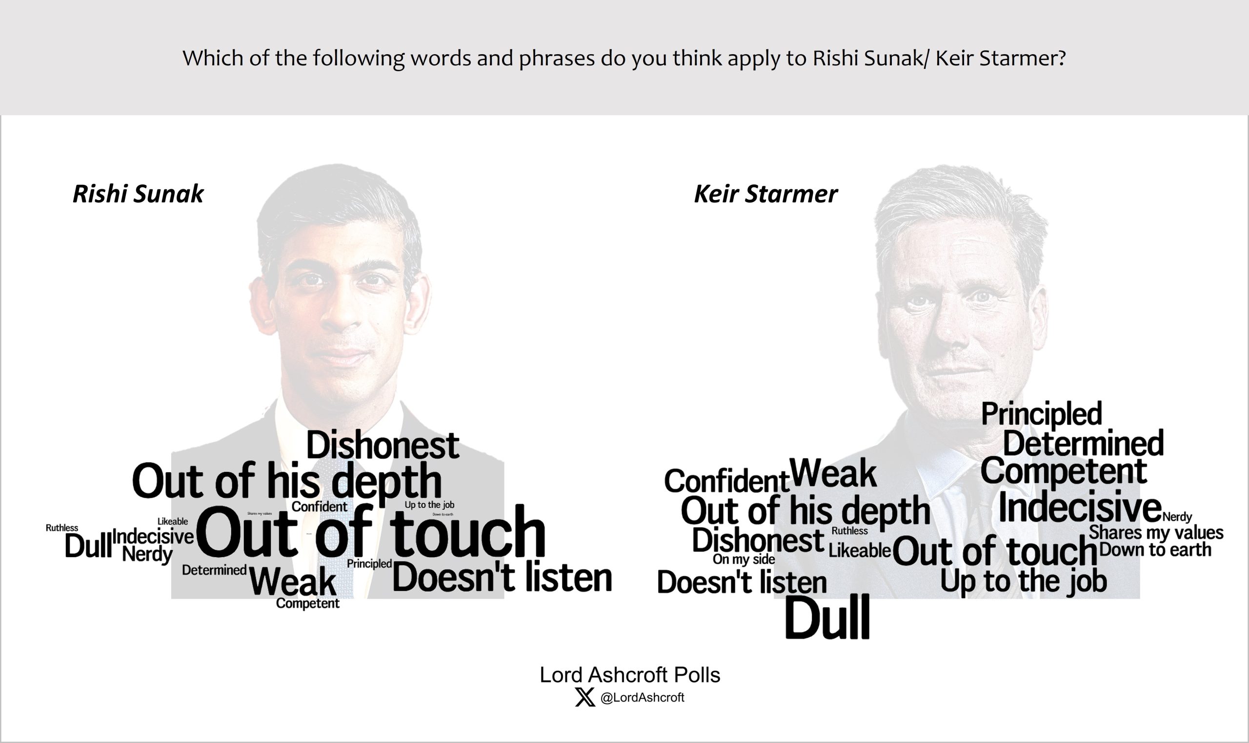 Asked to choose from a list of words that much describe the main party leaders, voters were most likely to select “out of touch” for Sunak, followed by “out of his depth” and “doesn’t listen”. For Starmer, the most popular choices were “dull”, “indecisive” and “out of touch”. The most positive choices were “determined” for Sunak (chosen by 12 per cent) and “competent” for Starmer (21 per cent).