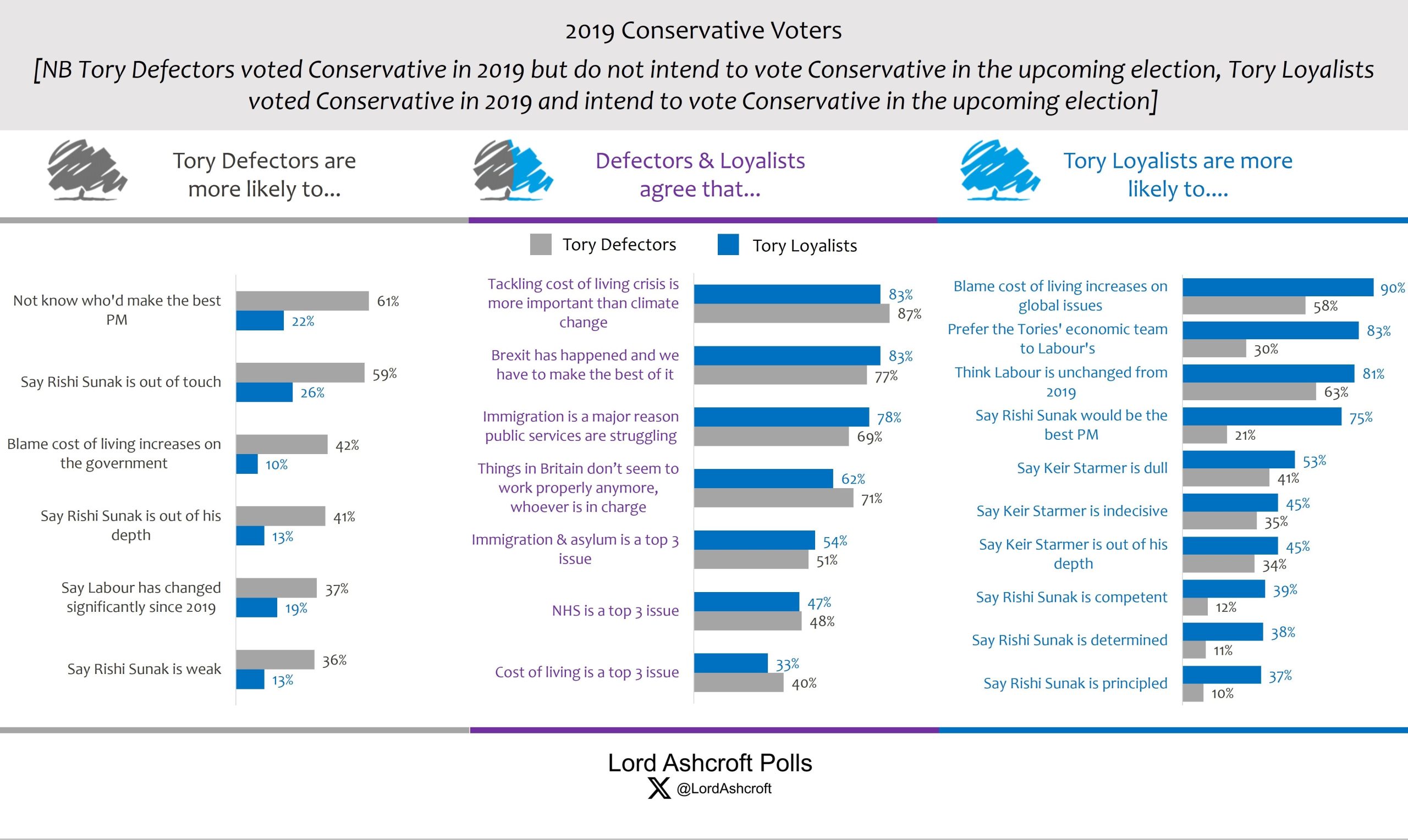 However, while loyalists are more likely to blame the cost of living on global issues, trust the Tories on the economy, think Sunak is the best available PM, and have a negative view of Starmer and Labour, defectors are much more likely to blame the government for cost of living increases, believe Labour has changed significantly, and think Sunak is out of touch, weak and out of his depth.