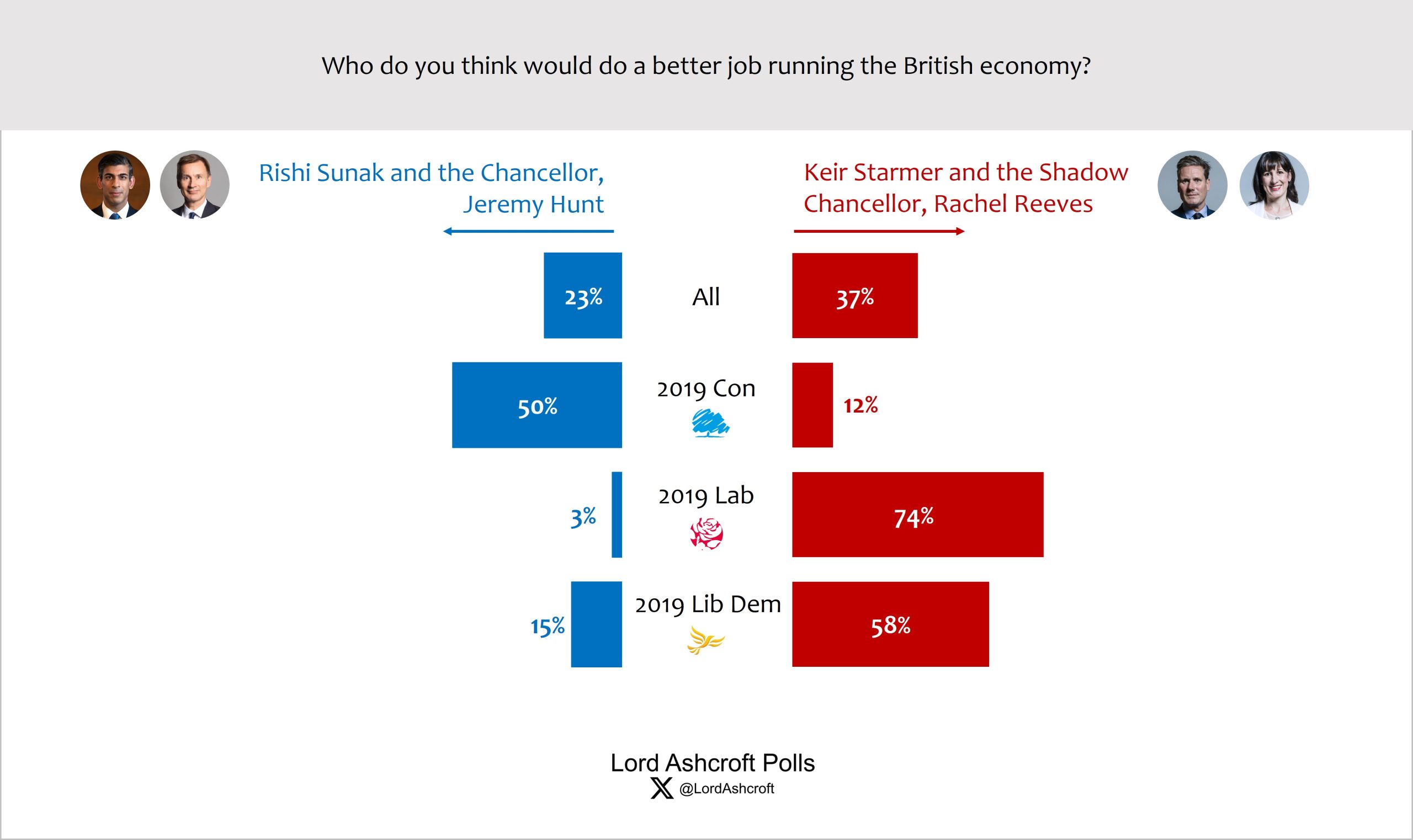 On the economy, voters said they thought Starmer and Rachel Reeves would do a better job than Sunak and Jeremy Hunt by a 14-point margin, a point narrower than in our final pre-campaign poll. Nearly 4 in 10 (39 per cent) said “don’t know”, including two-thirds of those leaning towards Reform UK.