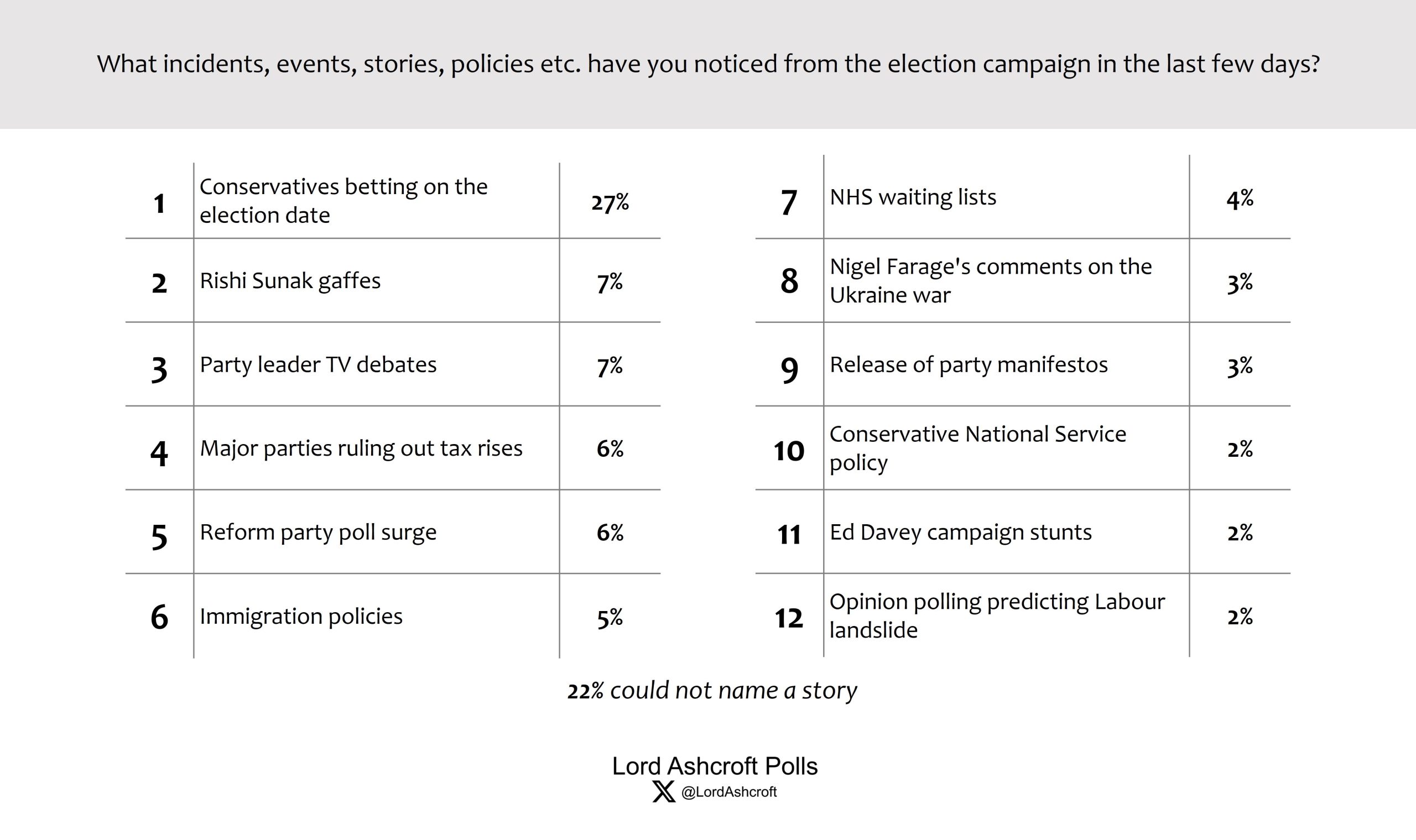 Conservatives betting on the election date was by far the most recalled election story of the last few days, and is in fact the most recalled story of any round of campaign polling – ahead of the Prime Minister leaving D-Day commemorations early and the Tories’ national service policy. ‘Rishi Sunak gaffes’ included D-Day, being deprived of Sky TV, and last week’s unsuccessful attempt to feed a sheep.