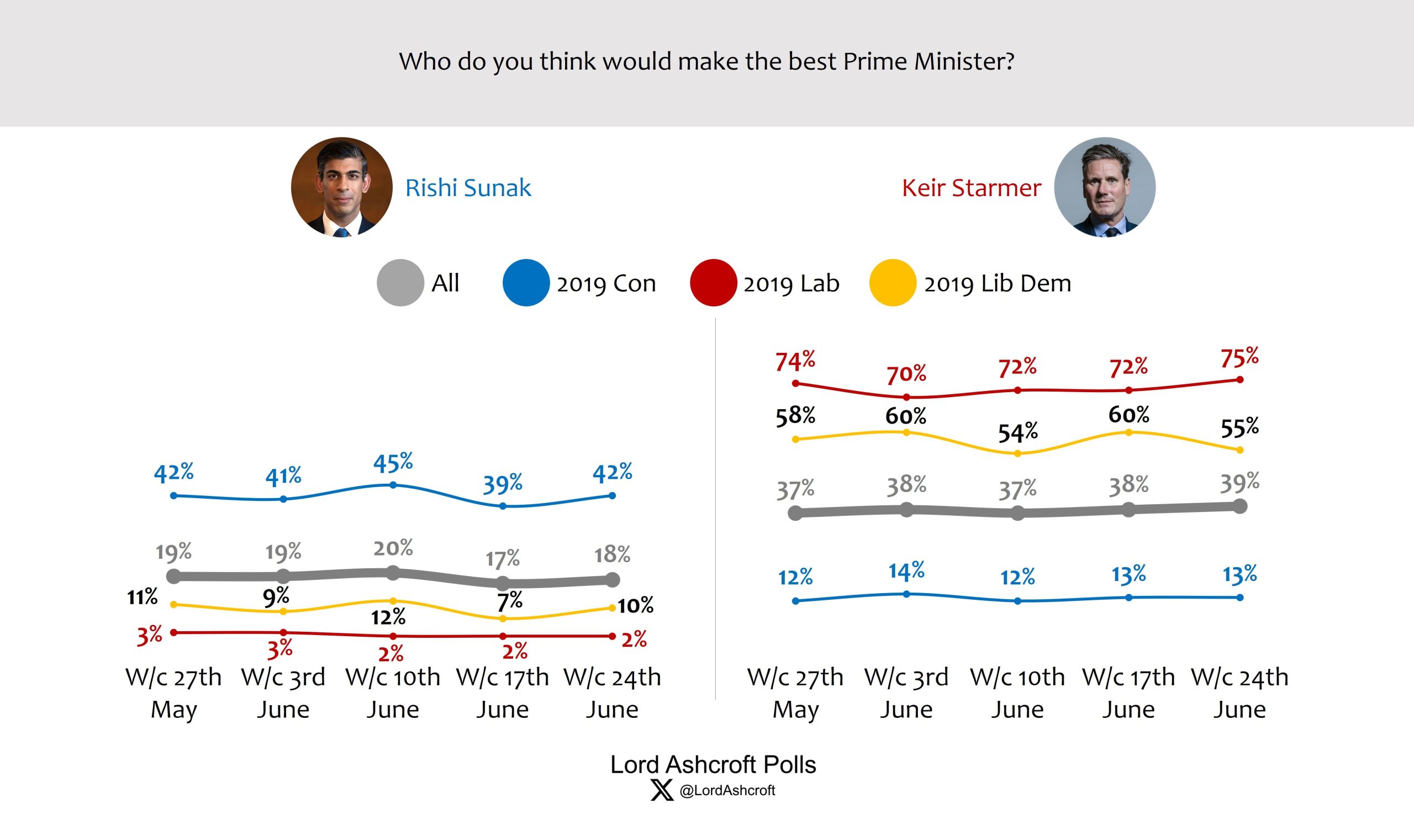 Among 2019 Tories, the mean likelihood of voting Conservative again on 4 July was 39/100, up two points from last week’s low of 37.