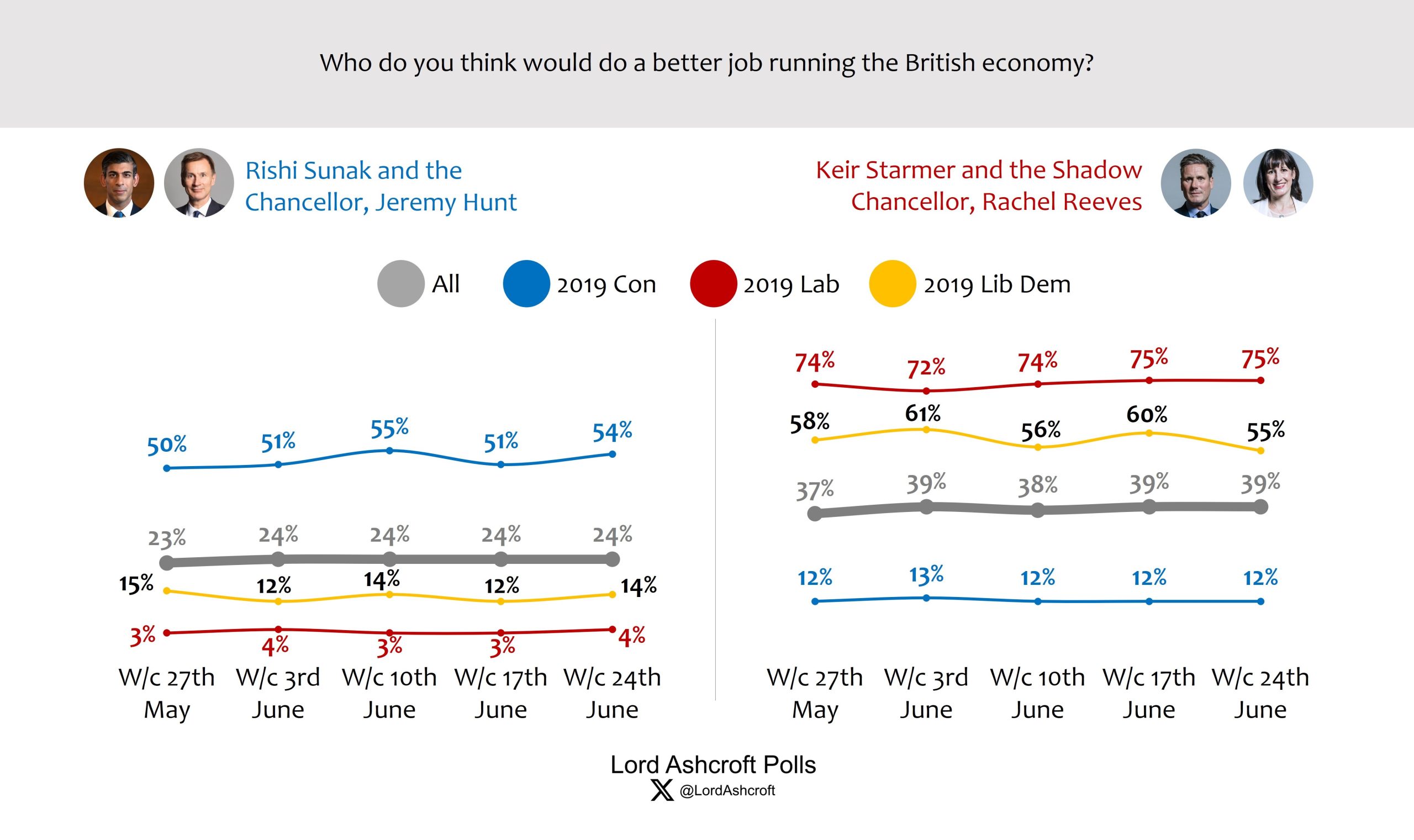 Voters currently leaning towards Reform UK preferred Sunak over Starmer by 24 per cent to eight per cent, with 68 per cent saying “don’t know”. On the question of who would do the better job running the British economy, the Labour team’s lead is also unchanged since last week’s survey.
