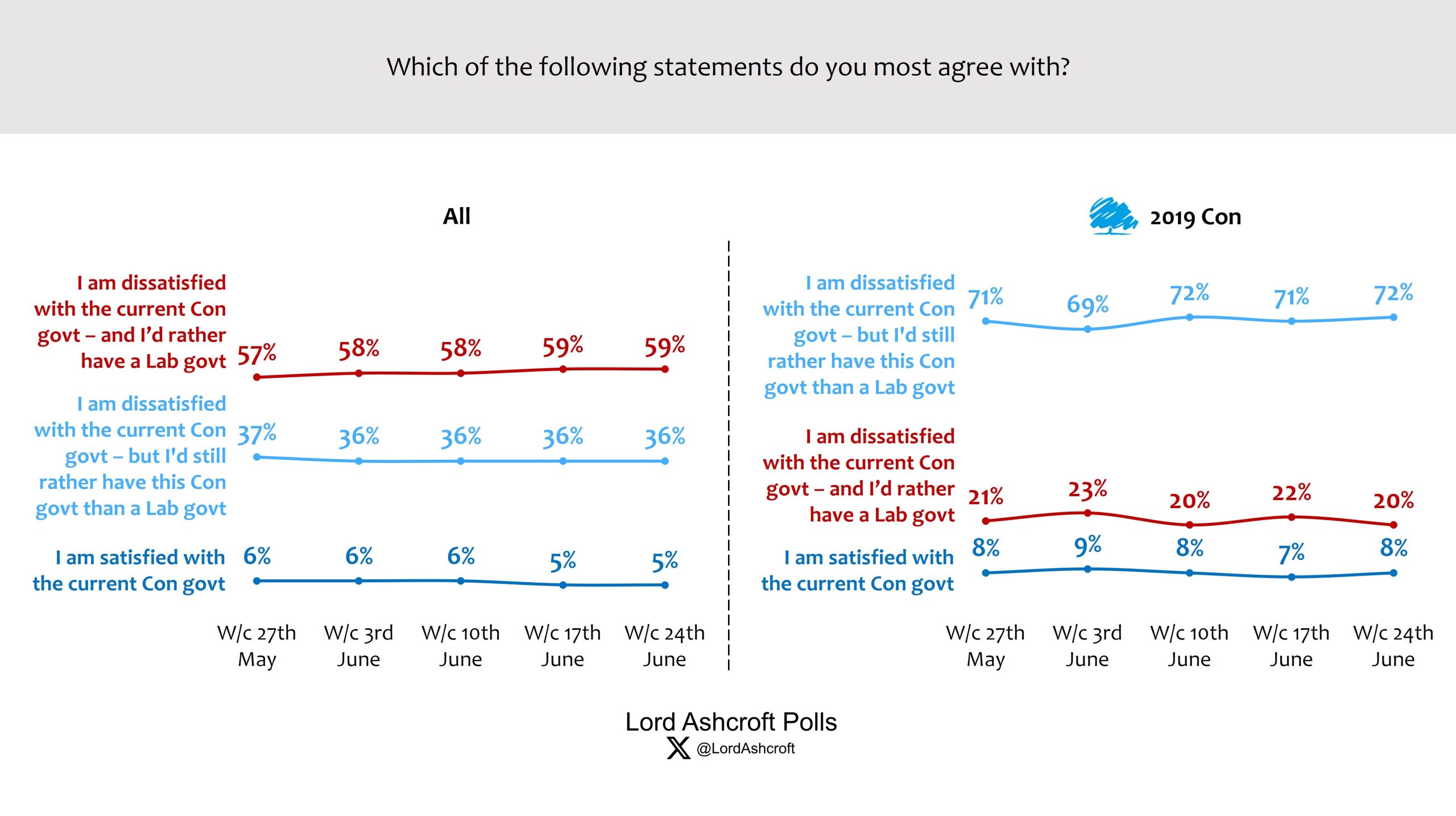 The proportion of voters saying they are satisfied with the current government remains unchanged since last week at one in 20. This includes eight per cent of those who voted Conservative in 2019.
