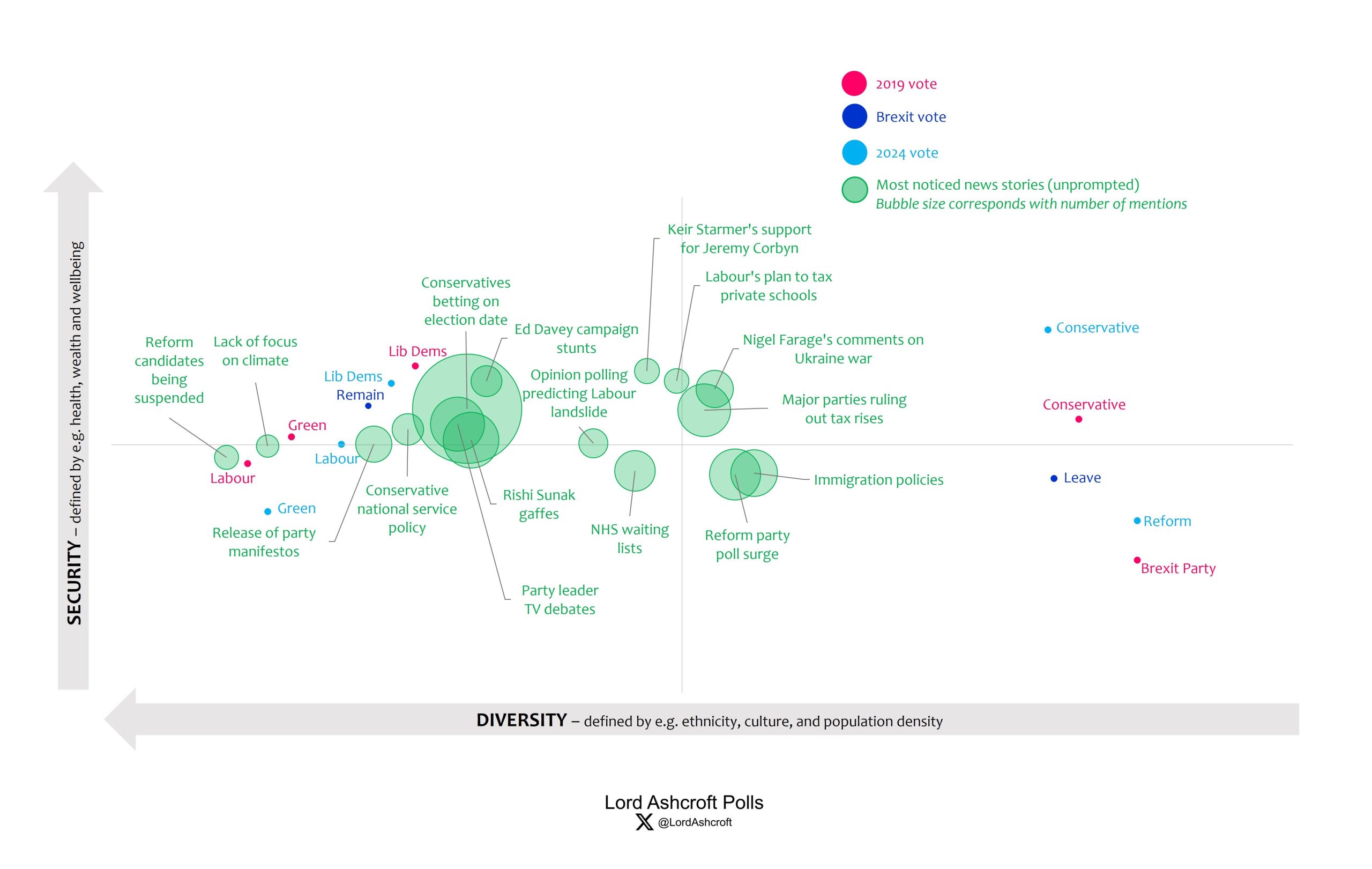 Few stories are most likely to have been noticed in the more Conservative-inclined right-hand side of the map, especially the less prosperous, Leave-voting bottom right – though stories about immigration and Reform UK were most likely to have been recalled by these voters.