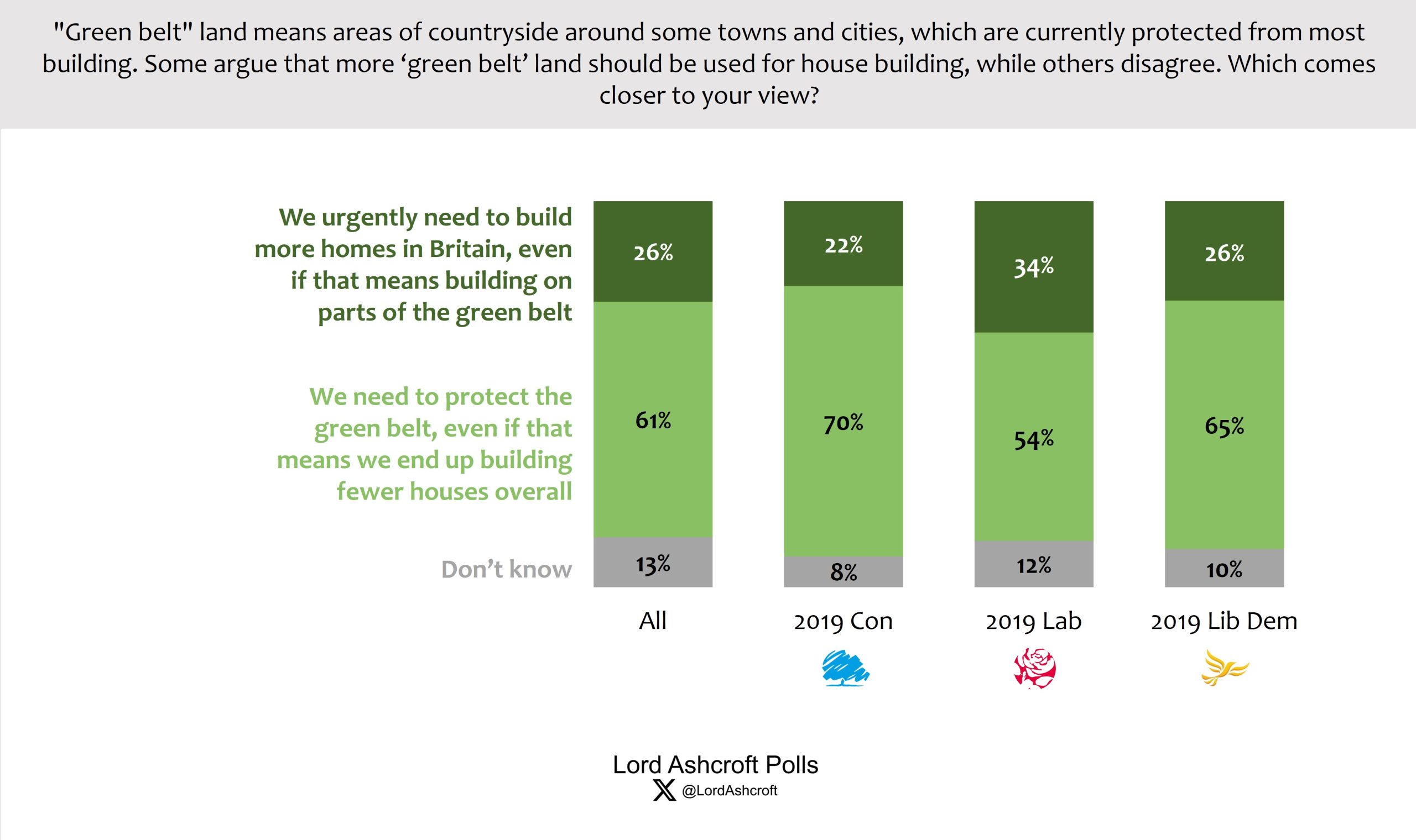More than six in ten, including a majority of both former and current likely Labour voters, agreed with the alternative statement “we need to protect the green belt, even if that means we end up building fewer houses overall.”