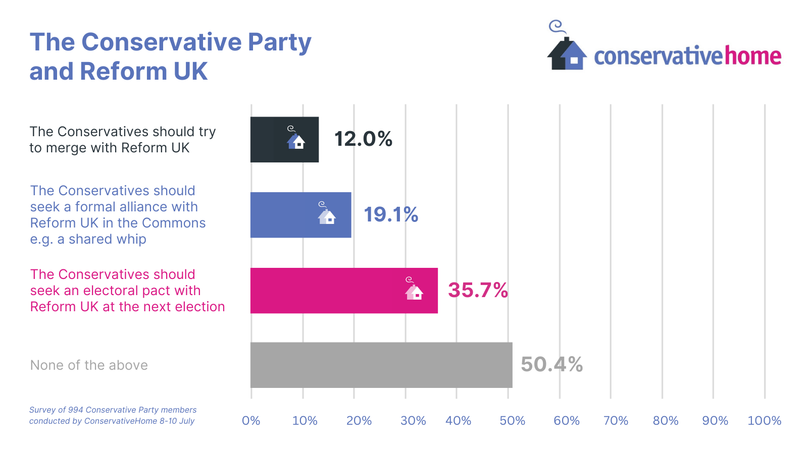 Personally, with three hundred-odd years of history behind us, Nigel Farage’s patchy record, and a previous example of our winning over his voters, I believe that the Conservative Party feeling it has to throw in its 121 MPs with Reform’s 5 would be a mistake, whatever form that would take. From our latest post-election panel, it seems a bare majority of our survey respondents agree.