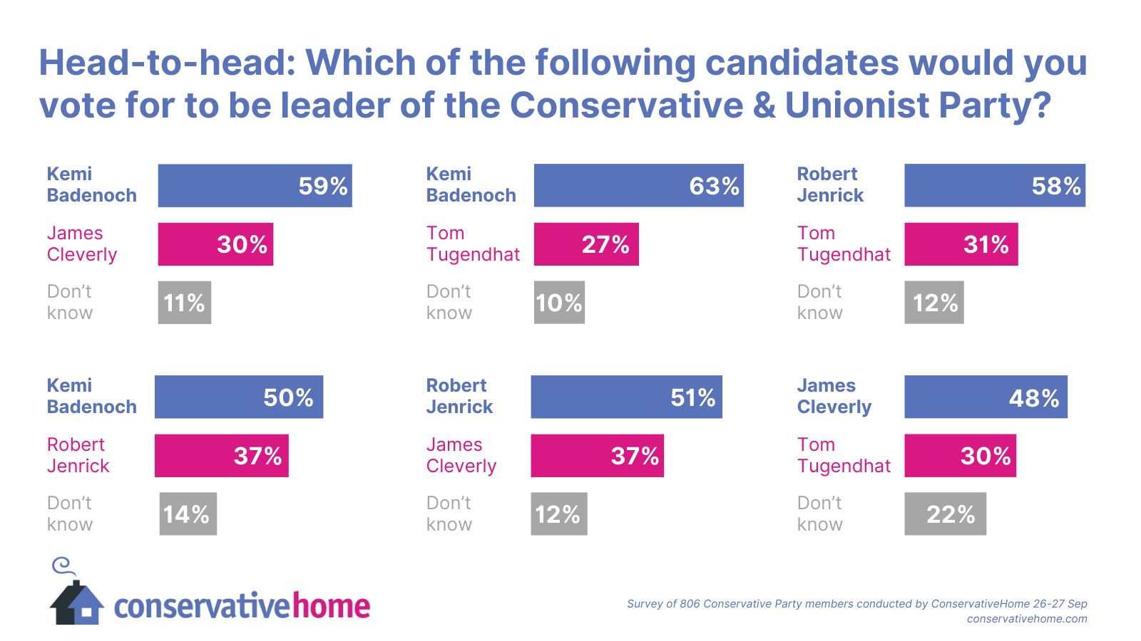 Other than that, the picture hasn’t really changed much in our final-round questions: Badenoch still beats all comers, Jenrick sees off both the One Nation challengers, and Cleverly vanquishes Tugendhat (and by very similar margins to last time).