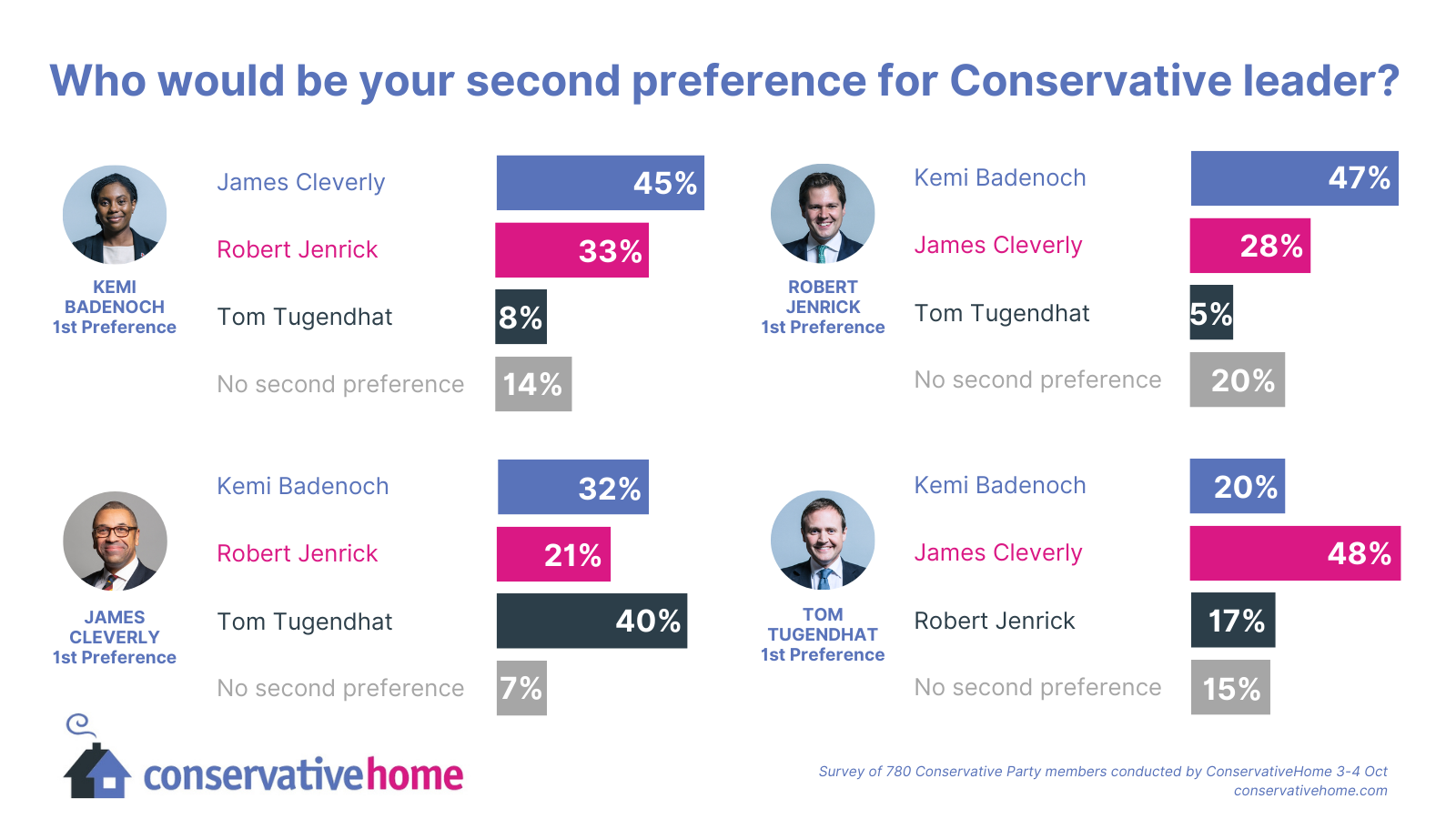 According to our latest survey, Robert Jenrick has lost all the ground he’d gained a week ago. Kemi Badenoch has also slipped back. Cleverly, meanwhile, has stormed ahead, picking up 12 points and comfortably taking second place in members’ first preferences. The row over the Chagos Islands, which broke out whilst the survey was open, clearly hasn’t hurt him much.
