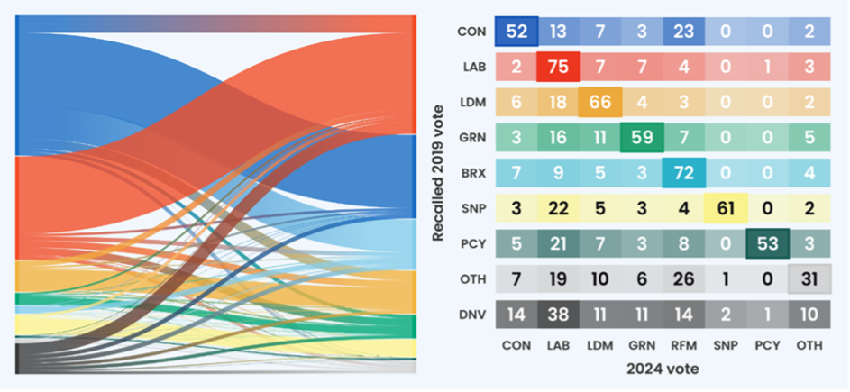 Flow of the vote, 2019 vote share to 2024 vote share by party