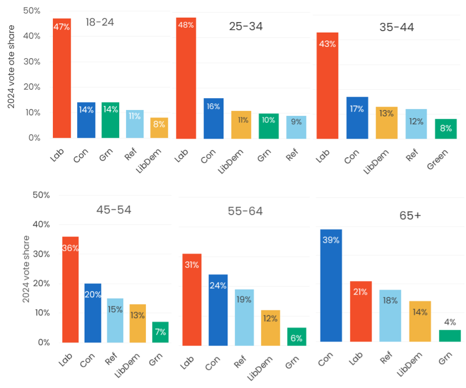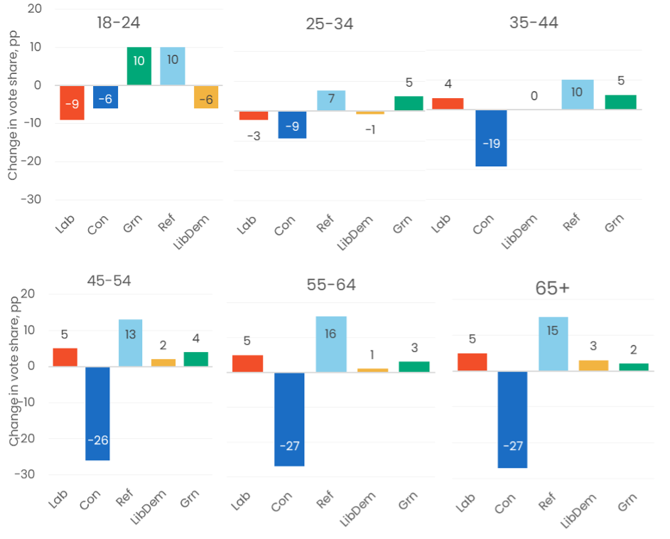 Change in vote share by age group, 2019 – 2024
