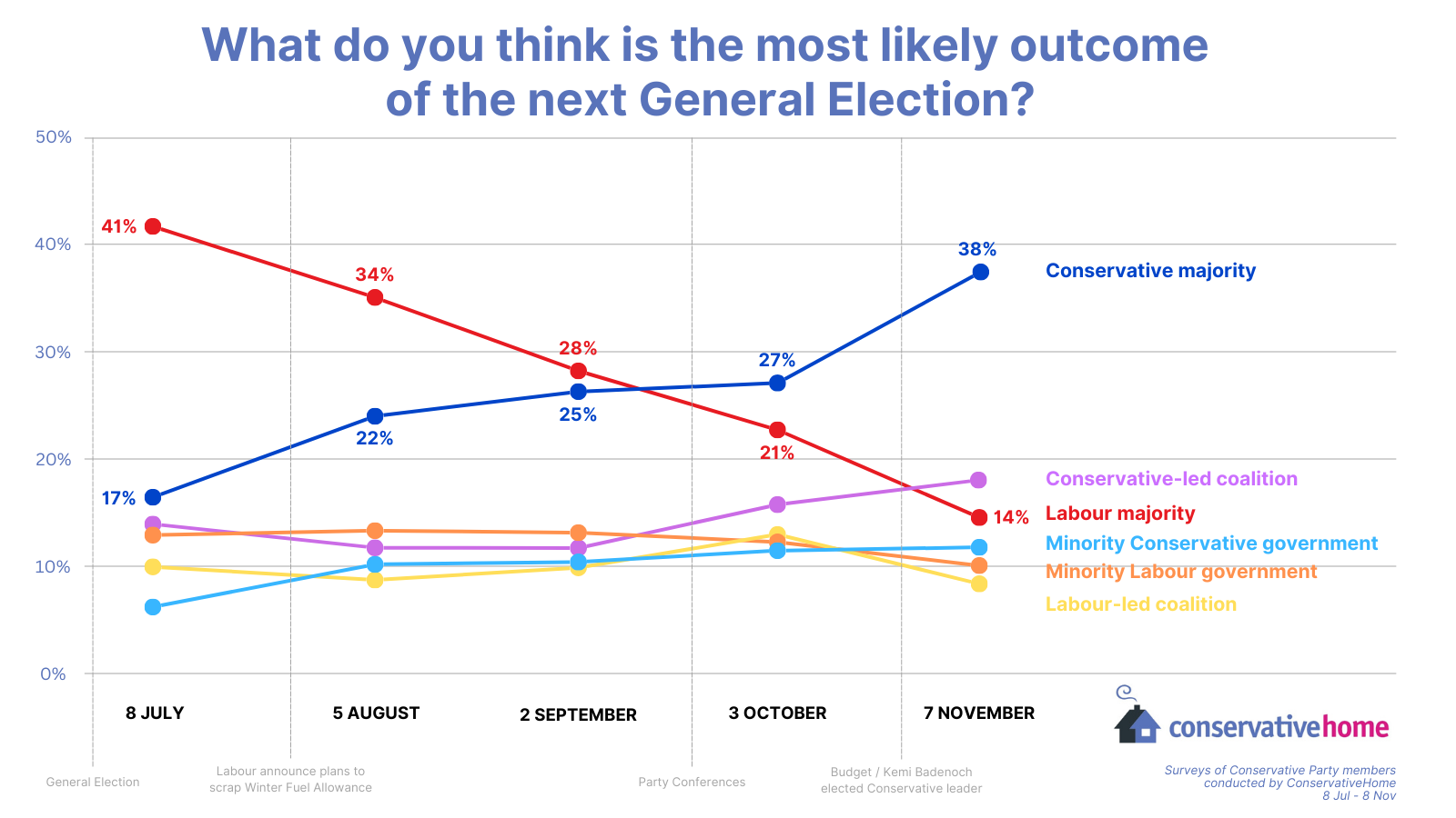But ten-and-a-half months is clearly a very long time in politics these days, for now no fewer than two thirds of respondents expect some kind of Conservative-led government after the next election – and more than a third expect the party to win outright!