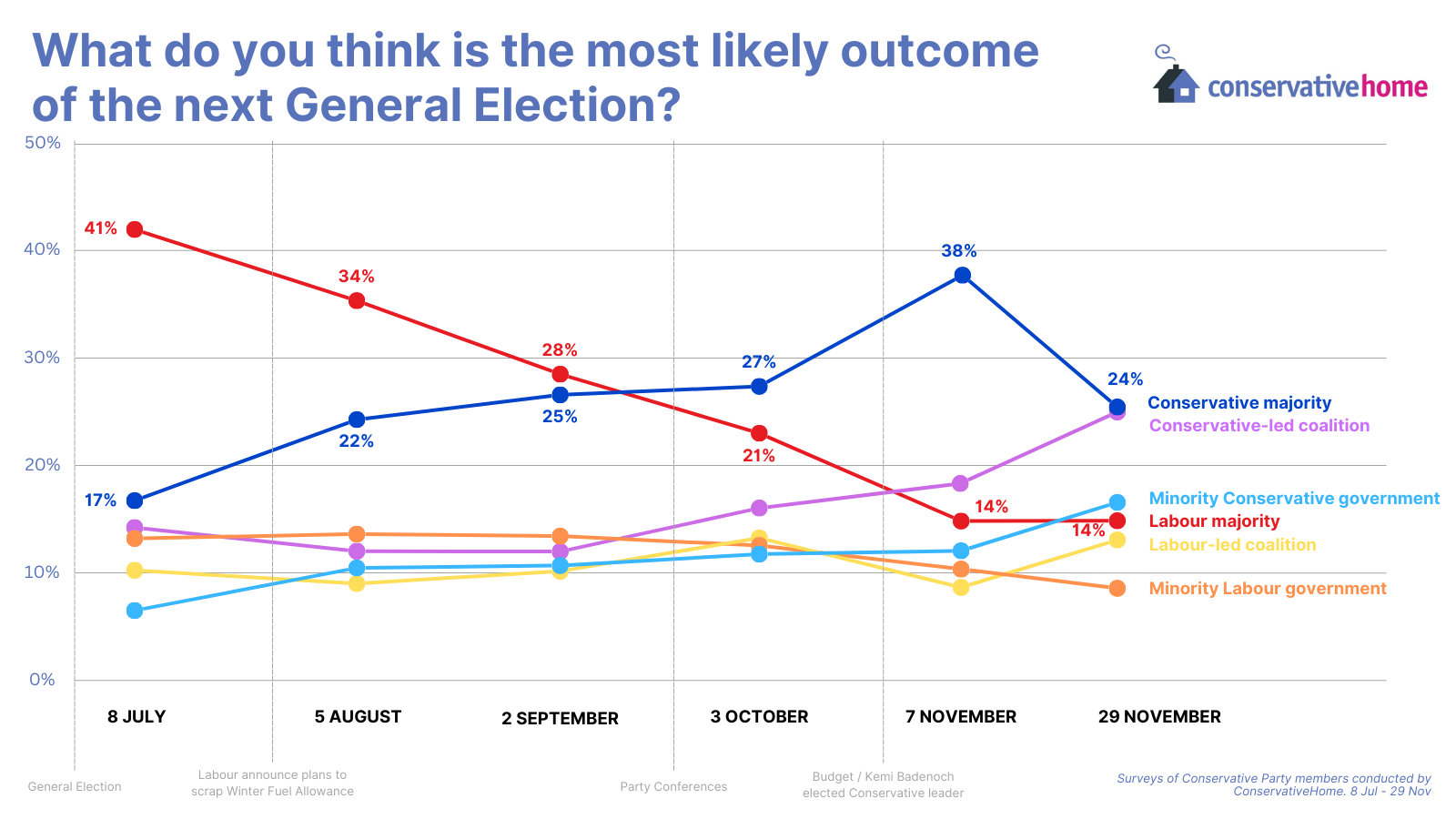 Every month, we ask our ConservativeHome survey panel what they believe is the most likely outcome of the next general election. In November, flushed with confidence based on Labour’s abysmal performance, a limp and unpopular Budget, and the arrival of Kemi Badenoch as our new leader, 38 per cent of respondents predicted a Tory majority, and 14 per cent a Labour one.