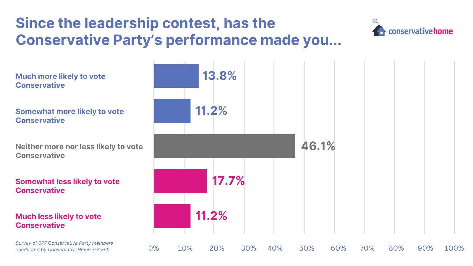 First, has Badenoch’s tenure made members more keen to vote Conservative? Has she sufficiently enthused them that they wouldn’t dream of making plans for Nigel? Erm. Not quite. Whilst we found almost half – 46.1 per cent – of the panel’s willingness to vote Tory was loyally unchanged, 25 per cent had become more likely to, but 28.9 per cent had become less likely.