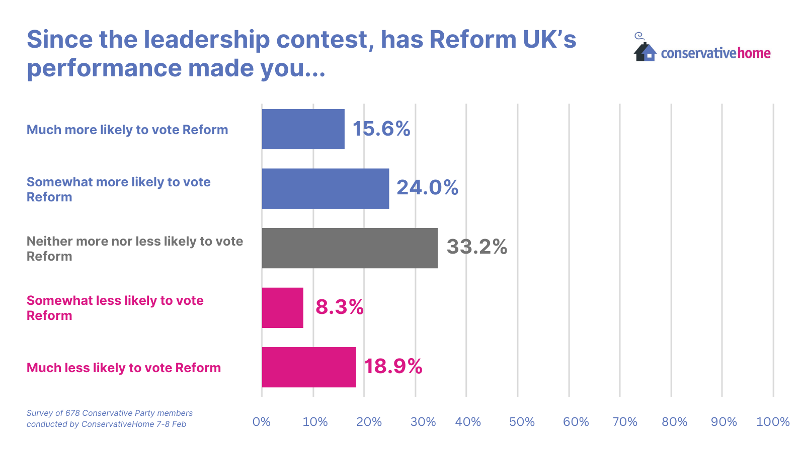 A substantial body of our panel has long been sympathetic to Farage. They wanted him admitted as a party member, they watch his GB News show, and their views on everything from membership of the ECHR to Net Zero are closer to his full-bodied opposition than Badenoch’s equivocation. His party must seem to fill a void that her underwhelming early leadership has so far left.