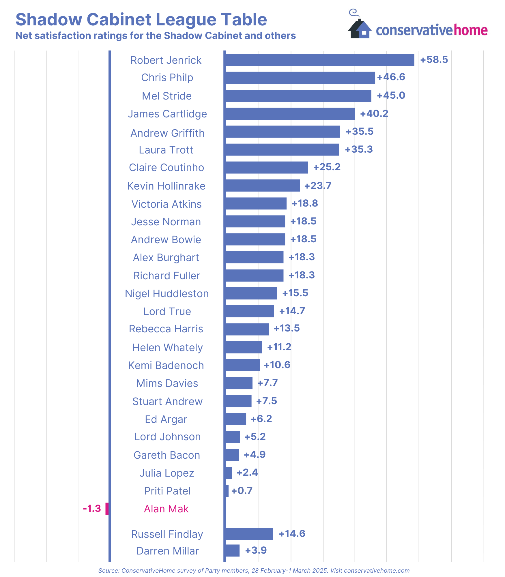 What else? Chris Philp and Mel Stride have swapped places on the podium, although the margin remains as razor-thin as last month. Just below them, there has been a surge in support for James Cartlidge: up almost 20 points and six places, from +19.8 last month to +40.2 this month.