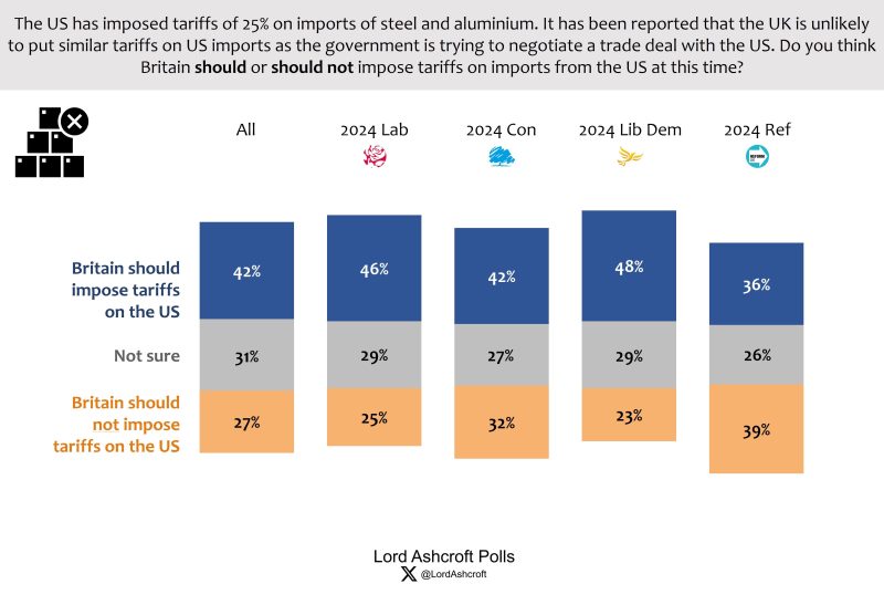 Following the imposition of tariffs onto steel and aluminium imports into the US, voters were more likely to say the UK should impose tariffs on US imports (42 per cent) than that we should not (27 per cent). Reform UK voters were the only group more likely to say Britain should not impose tariffs (39 per cent) than that we should (36 percent).
