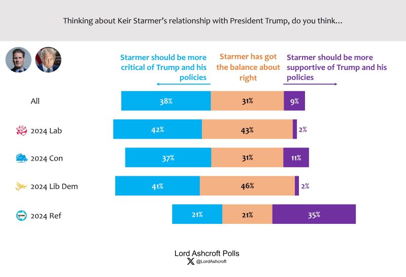 Voters as a whole were more likely to think Keir Starmer should be more critical of President Trump and his policies (38 per cent) than that he had got the balance about right (31 per cent); fewer than 1 in 10 (9 per cent) thought he should be more supportive of Trump. Labour voters from 2024 were among the most likely to say Starmer had got the balance right, but also the most likely to say he should be more critical.
