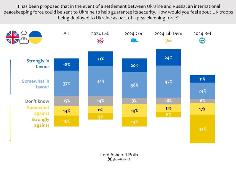 A majority (55 per cent) of voters as a whole said they were in favour of British troops being deployed to Ukraine as part of an international peacekeeping force in the event of a settlement with Russia. Those who voted Reform UK were the only group more likely to oppose British troops’ participation (59 per cent) than support it (35 per cent).