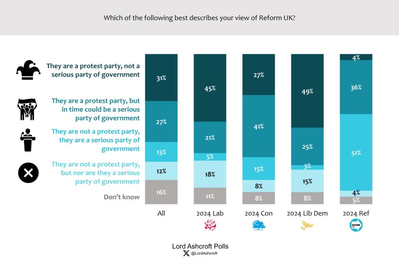 A majority (58 per cent) of all voters said they saw Reform UK as a protest party, but were slightly more likely than not to think it could in time be a serious party of government – 2024 Conservatives were the most likely to take this latter view (41 per cent). Just over half (51 per cent) of 2024 Reform UK voters said they thought they were already a serious party of government, as did 56 per cent of those currently leaning towards voting Reform at the next election.
