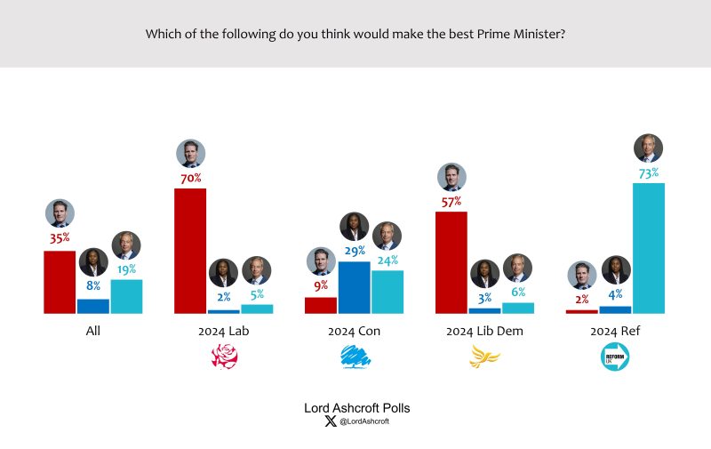 Offered a choice between Starmer, Badenoch and Farage, voters chose Starmer over Farage by 35 per cent to 19 per cent (compared to 30 per cent to 23 per cent last month), with Badenoch in third place on 8 per cent. 2024 Conservatives named Badenoch over Farage by 29 per cent to 24 per cent.