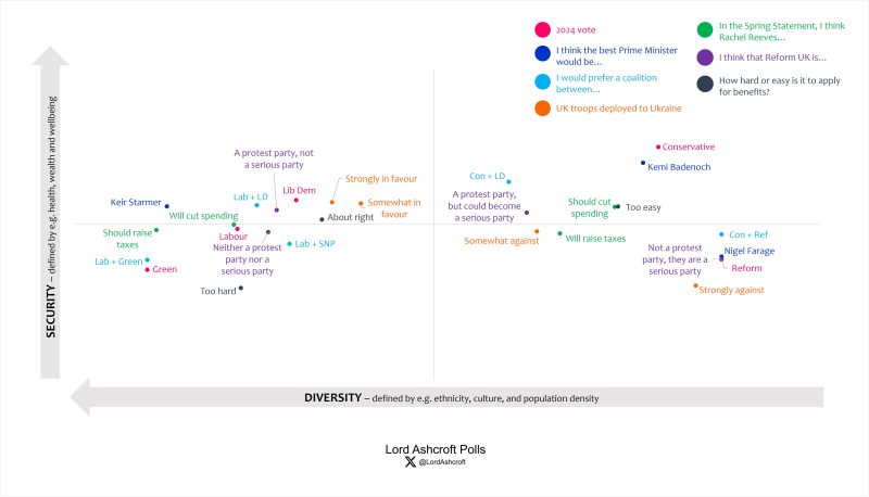As above, our political map shows how different issues, attributes, personalities and opinions interact with one another. Each point shows where we are most likely to find people with that characteristic or opinion; the closer the plot points are to each other the more closely related they are. Here we see how opinion is distributed on who would make the best PM, people’s preferred coalition, what Rachel Reeves should and will do in the Spring Statement, whether it is too easy or too hard to apply for benefits, and whether Reform is a protest party or a serious party of government.