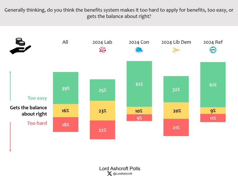 Voters as a whole were more likely to think the system makes it too easy to apply for benefits (39 per cent) than to think it was too hard (18 per cent) or that the balance was about right (16 per cent). 2024 Labour voters were fairly evenly divided between the three views. Conservative and Reform voters were much more likely to think it was currently too easy to claim benefits (both 61 per cent).