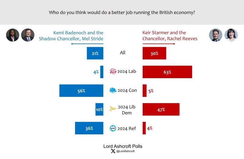 Asked who would do the better job running the economy, voters chose Starmer and Rachel Reeves over Badenoch and Mel Stride by 30 per cent to 21 per cent (up from 28 per cent to 23 per cent last month) with just under half (49 per cent) saying “don’t know”.