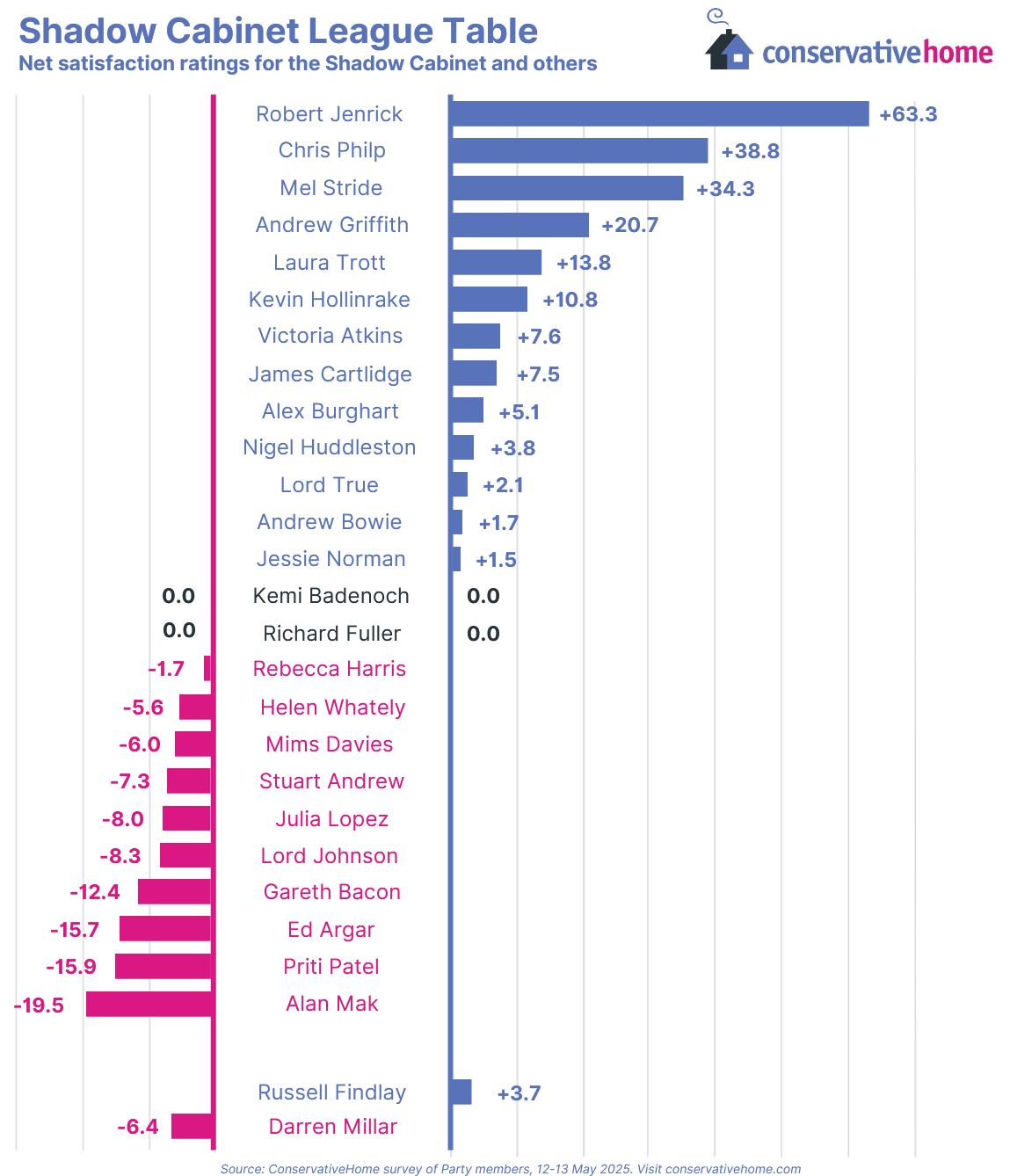 You may have noticed your eyes immediately scan downwards to the minus numbers when looking at our latest Shadow Cabinet league table. That is because ten shadow cabinet minister have fallen into negative ratings; only just avoiding April 2024’s record of 12 disappointed members sinking into the pink chart.