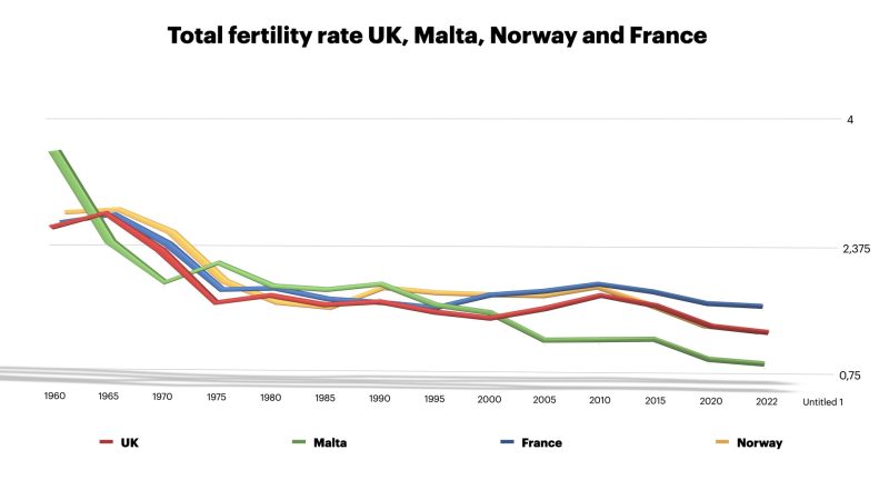 Despite the recent economic growth, Malta has the lowest fertility rate in the EU, with only 1.08 children per woman. Yet, back in 1960 Malta had a 3.6 fertility rate. In 2012, the fertility rate was 1.42, similar the UK today, before falling to its all-time low at 1.08 children per woman. Malta’s sharp decline in fertility and birth rate provides a warning to the UK that birth-rate numbers can go much lower, with significant consequences.