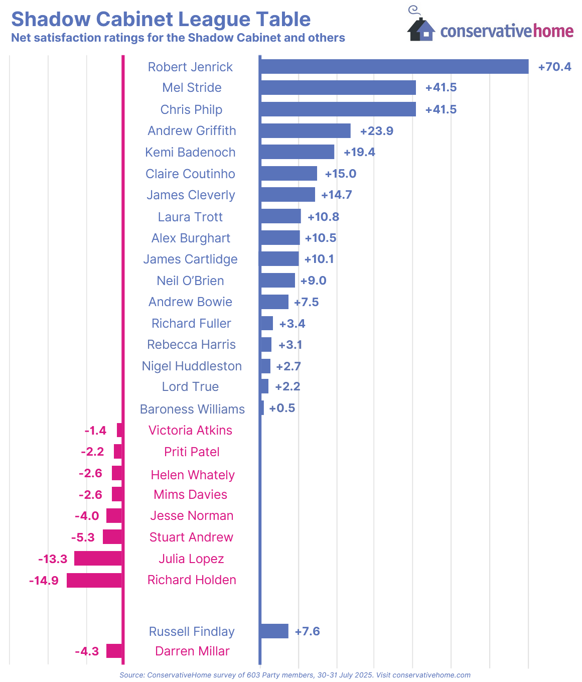 Robert Jenrick’s dominance appears to be unassailable. This month’s Shadow Cabinet League Table places him comfortably on top, yet again, with +70.4 – almost identical to the towering +71.0 he posted last month.