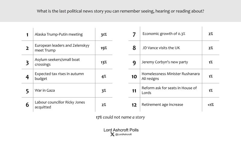 Two stories dominated people’s recollections of recent political news – the Trump-Putin Alaska summit and the surrounding diplomacy over the Ukraine war. Stories about asylum and small boat crossings featured most heavily on the domestic scene.