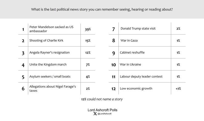 The resignations of Peter Mandelson and Angela Rayner dominated respondents’ recollections of domestic political news, followed by Tommy Robinson’s Unite the Kingdom march in London. The shooting of Charlie Kirk was the second most recalled story.