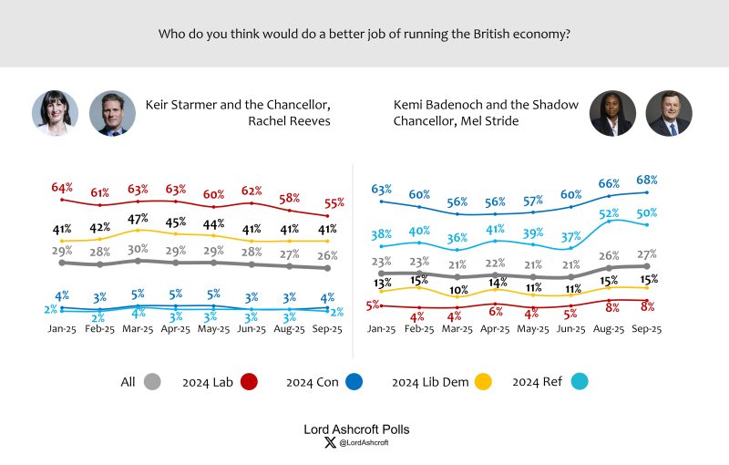 Asked who would do the better job running the economy, voters chose Kemi Badenoch and Mel Stride over Keir Starmer and Rachel Reeves by 27 per cent to 26 per cent, with just under half saying “don’t know” – the first Conservative lead on the issue since before the election. Only 55 per cent of 2024 Labour voters named the Labour team; more than two thirds of 2024 Conservatives chose the Tory team.