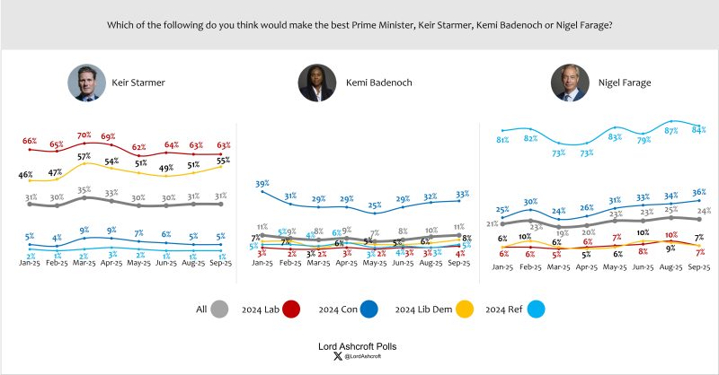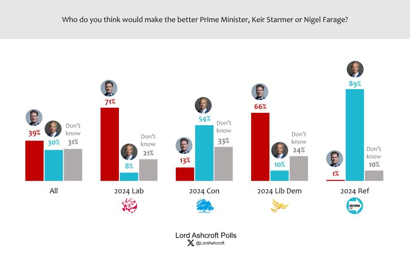 Given a choice between Starmer and Farage, voters as a whole chose Starmer by a 9-point margin, with 31 per cent saying “don’t know”. 2024 Conservatives chose Farage over Starmer by 54 per cent to 13 per cent, while 2024 Labour voters chose Starmer by 71 per cent to 8 per cent.