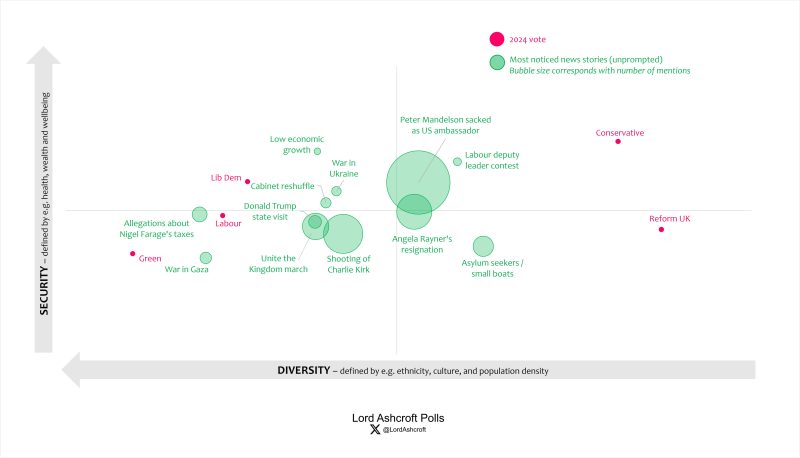 Our political map shows what kind of voters were most likely to recall which news. The two resignations appear close to the centre of the map, showing that recall of those stories was fairly even throughout the electorate. Notably, stories about Charlie Kirk, President Trump’s state visit and the Unite the Kingdom march were most likely to be mentioned in more left-leaning territory.
