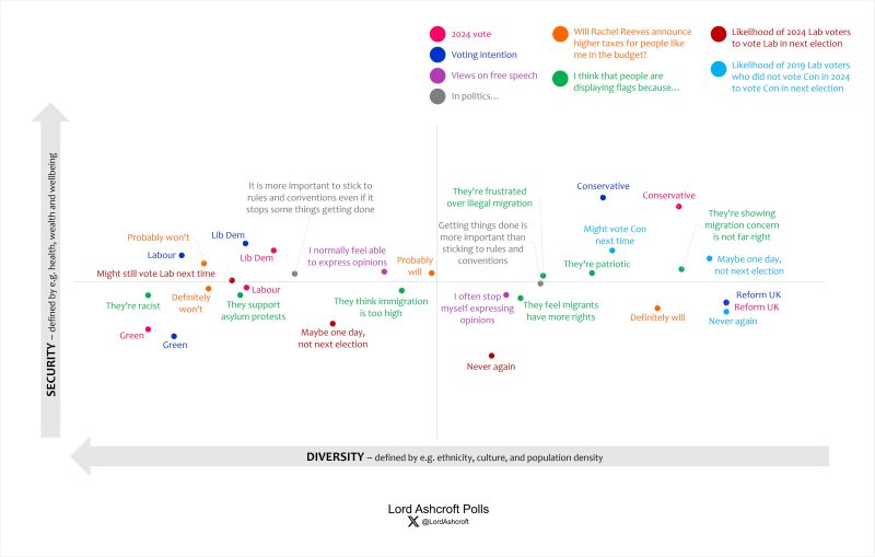 As above, our political map shows how different issues, attributes, personalities and opinions interact with one another. Each point shows where we are most likely to find people with that characteristic or opinion; the closer the plot points are to each other the more closely related they are. For example, we can see that those who feel comfortable expressing their opinion on controversial issues are most likely to be found in the more prosperous and diverse Labour-leaning top-left quadrant, while those who often feel they have to stop themselves saying what they think are most likely to appear in the less well-off, less diverse, Reform-leaning bottom right. We also see the distribution of opinion as to what is behind the display of Union and St George’s flags – with those who think those doing it are racist, supporting asylum protests or think immigration is too high in the left-leaning side of the map, and those thinking the flag displayers are frustrated at the failure to control illegal migration, simply patriotic, or trying to show that concern over migration is not far-right on the opposite side. Among those who voted Labour in 2024 but currently do not say will do so next time, those who say they may go back to the party at some point are most likely to be found closer to the Labour centre of gravity; those who say they will never vote Labour again are most likely to appear in bottom right, possibly red wall territory. Those who say that in politics it is more important to follow rules and conventions are most prevalent in Labour and Lib Dem territory, while those who say that getting things done matters more are most likely to be found on the right-hand side of the map.