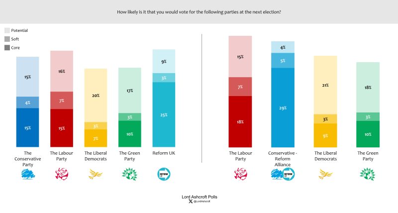 We can use people’s stated likelihood to vote for each party to estimate the floor and ceiling of support for Labour, the Conservatives, Reform, the Lib Dems, the Greens, and a theoretical Conservative-Reform Alliance. We do this by identifying three types of voters for each party: Core voters, Soft voters and Potential voters.